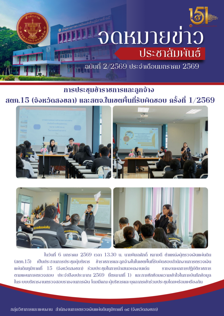 ประชุมข้าราชการและลูกจ้าง สตภ.๑๕ (จังหวัดสงขลา) และสตจ.ในเขตพื้นที่รับผิดชอบ ครั้งที่ ๑/๒๕๖๙ วันอังคารที่ ๖ เดือน มกราคม พ.ศ.๒๕๖๙ เวลา ๑๓.๐๐ น.